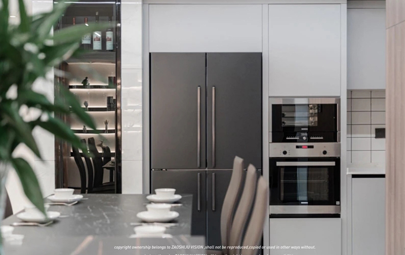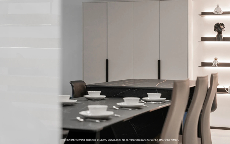 餐邊柜線條簡約利落,在黑色大理石紋餐桌的襯托下顯得尤為清新優(yōu)雅。