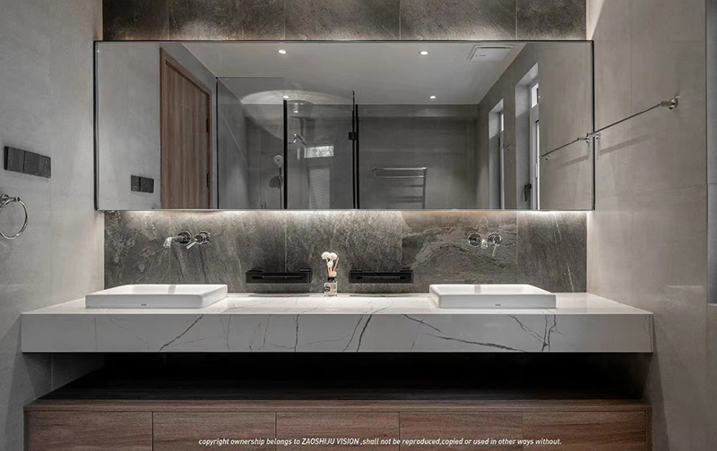 衛(wèi)浴室簡約實用,大理石紋和木紋是柔與硬的無聲碰撞。