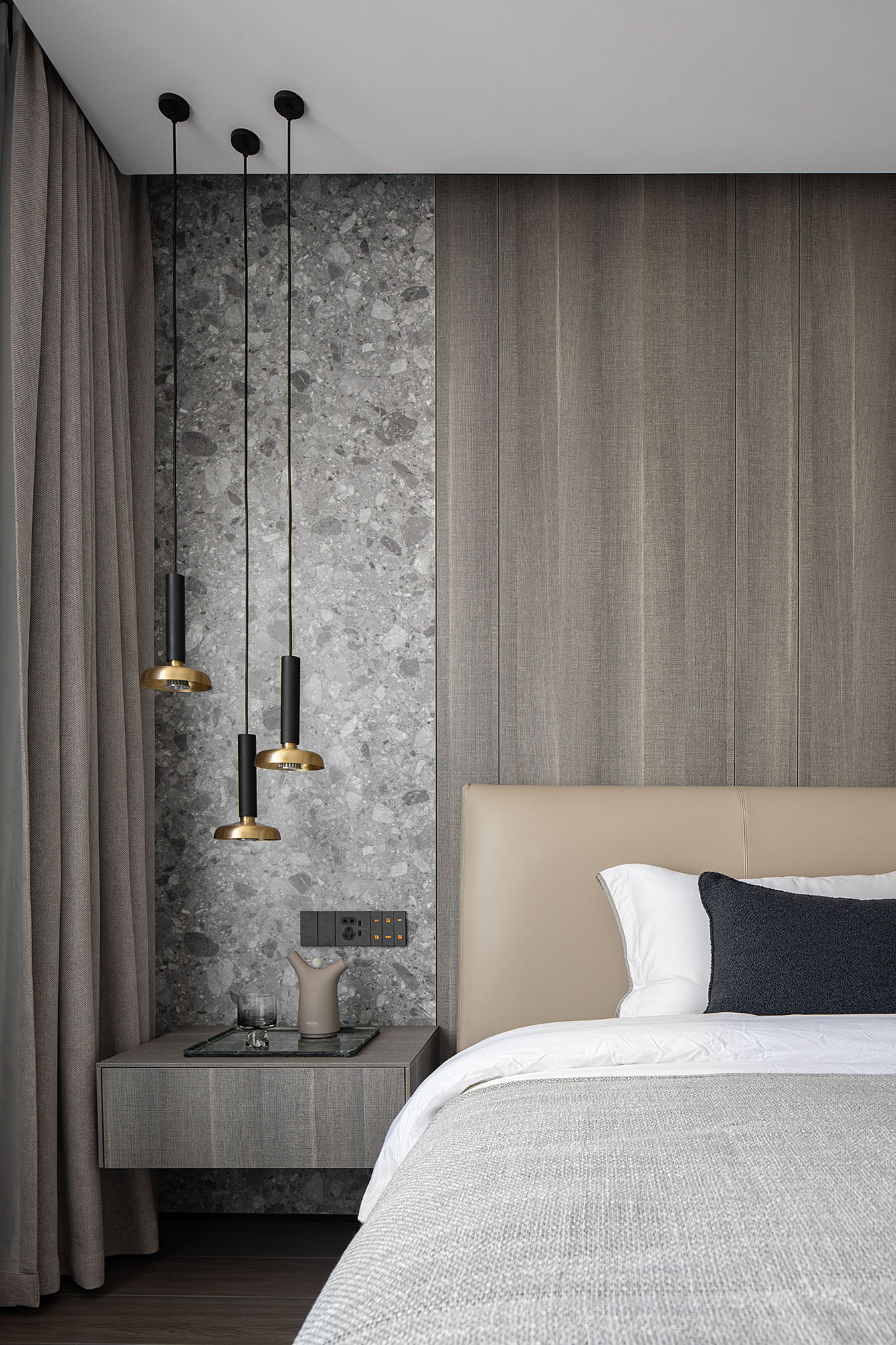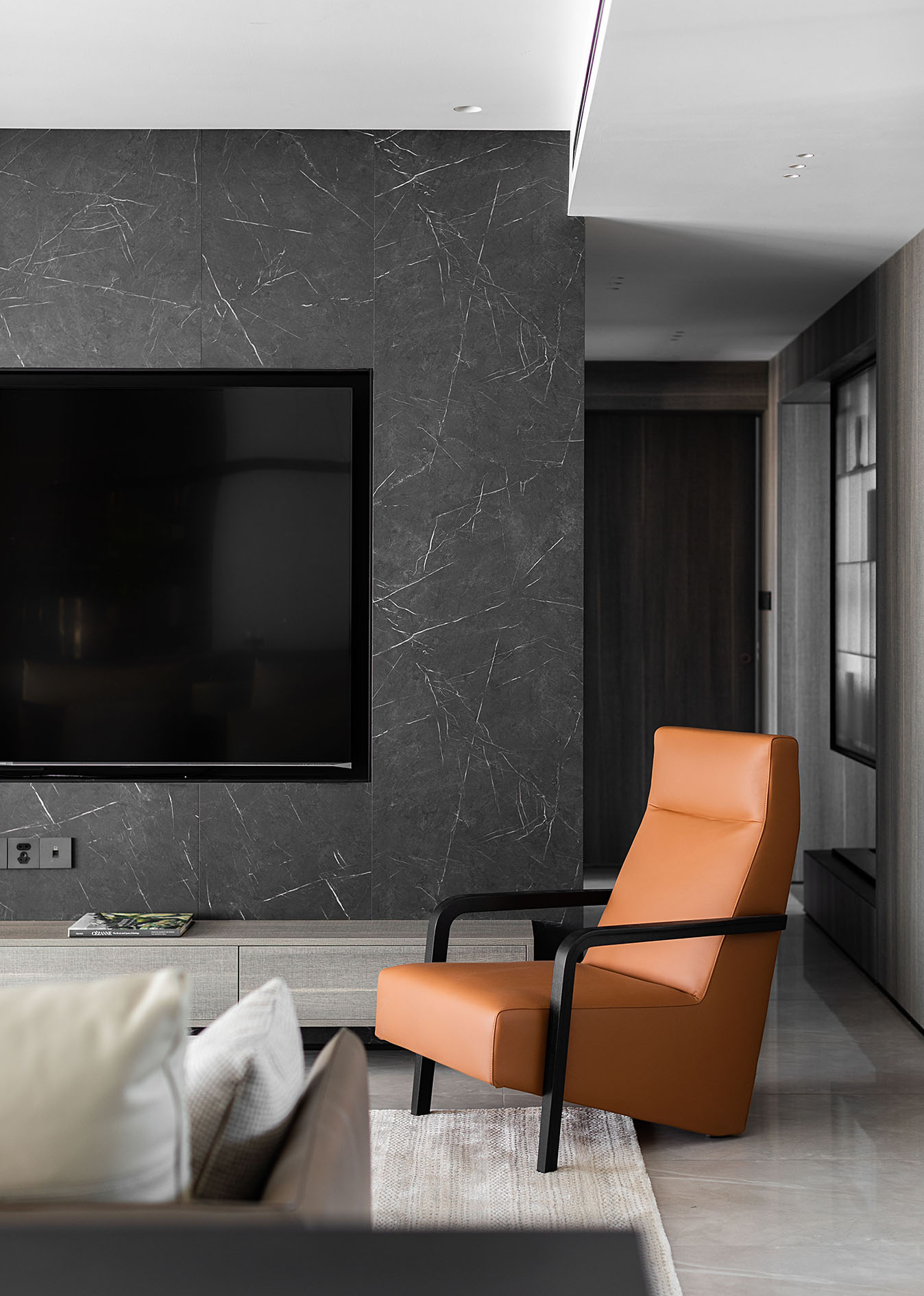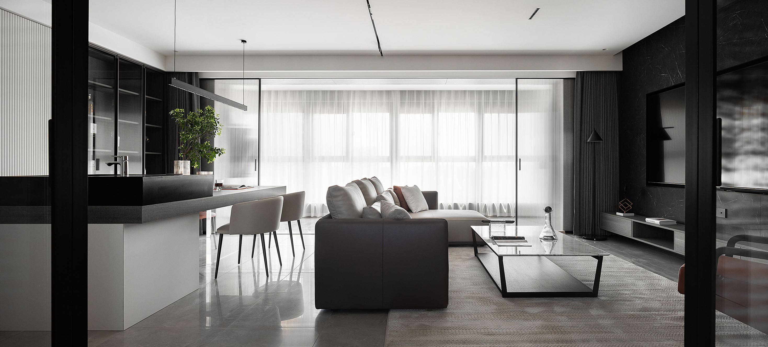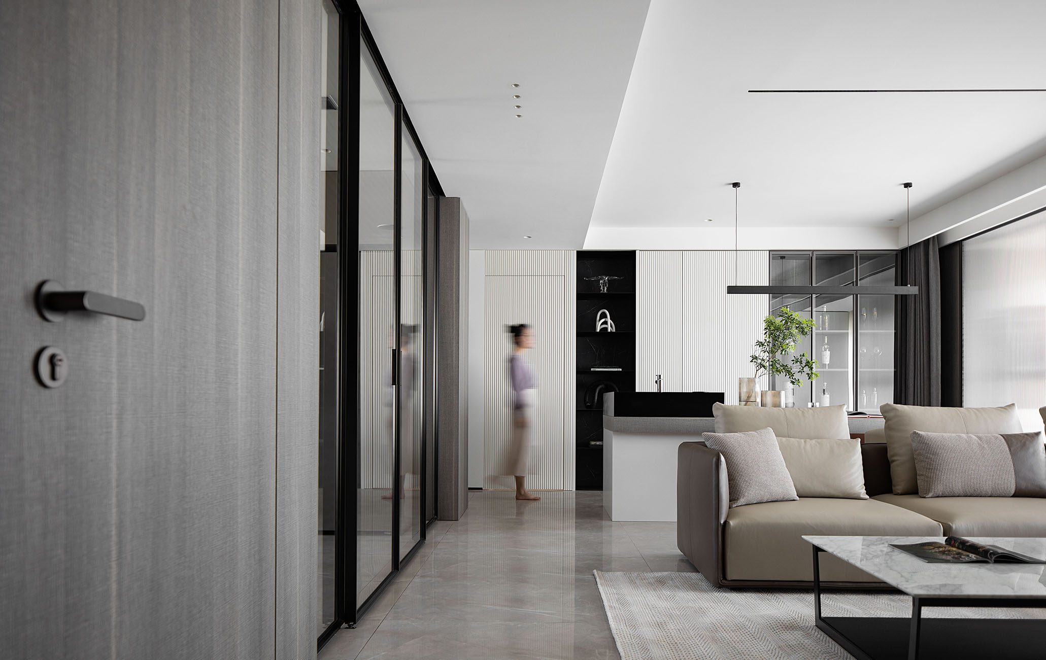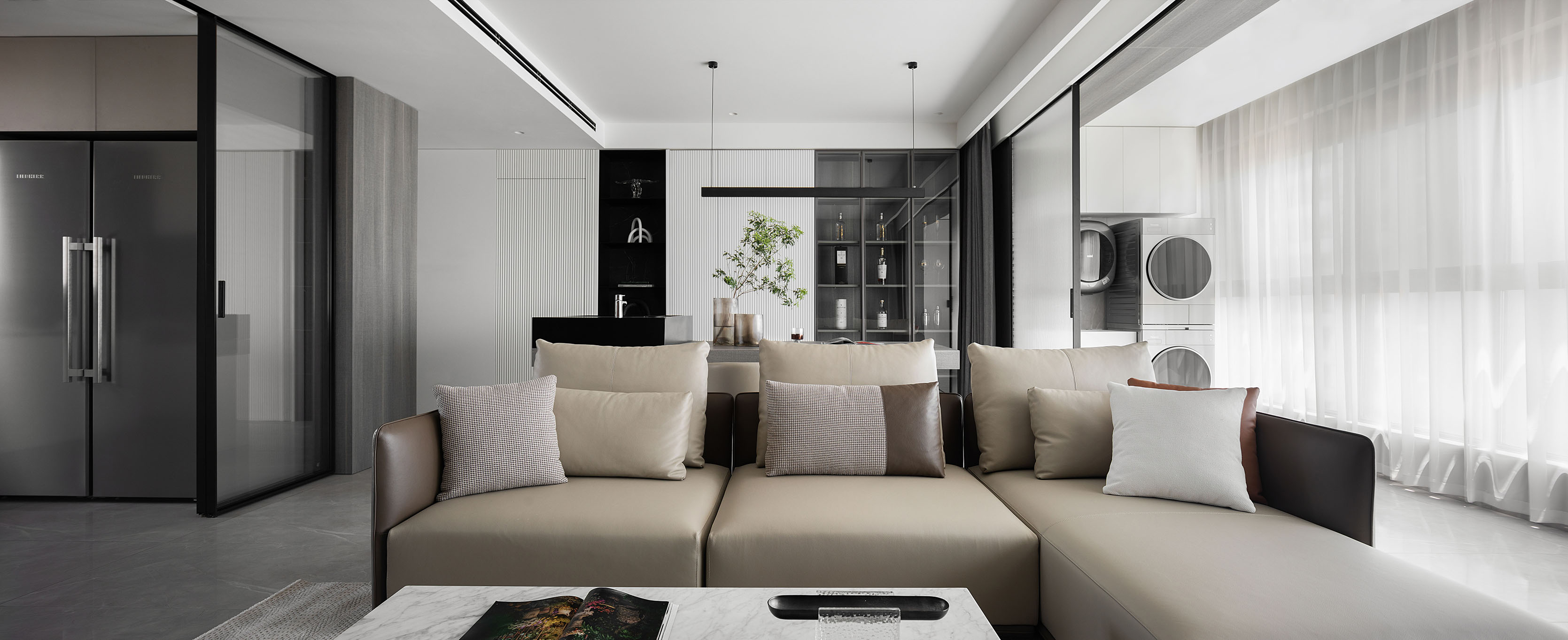 逼真的高級灰大理石紋理、柔和的駝灰色沙發(fā)、隔而未隔的鋁框玻璃移門,