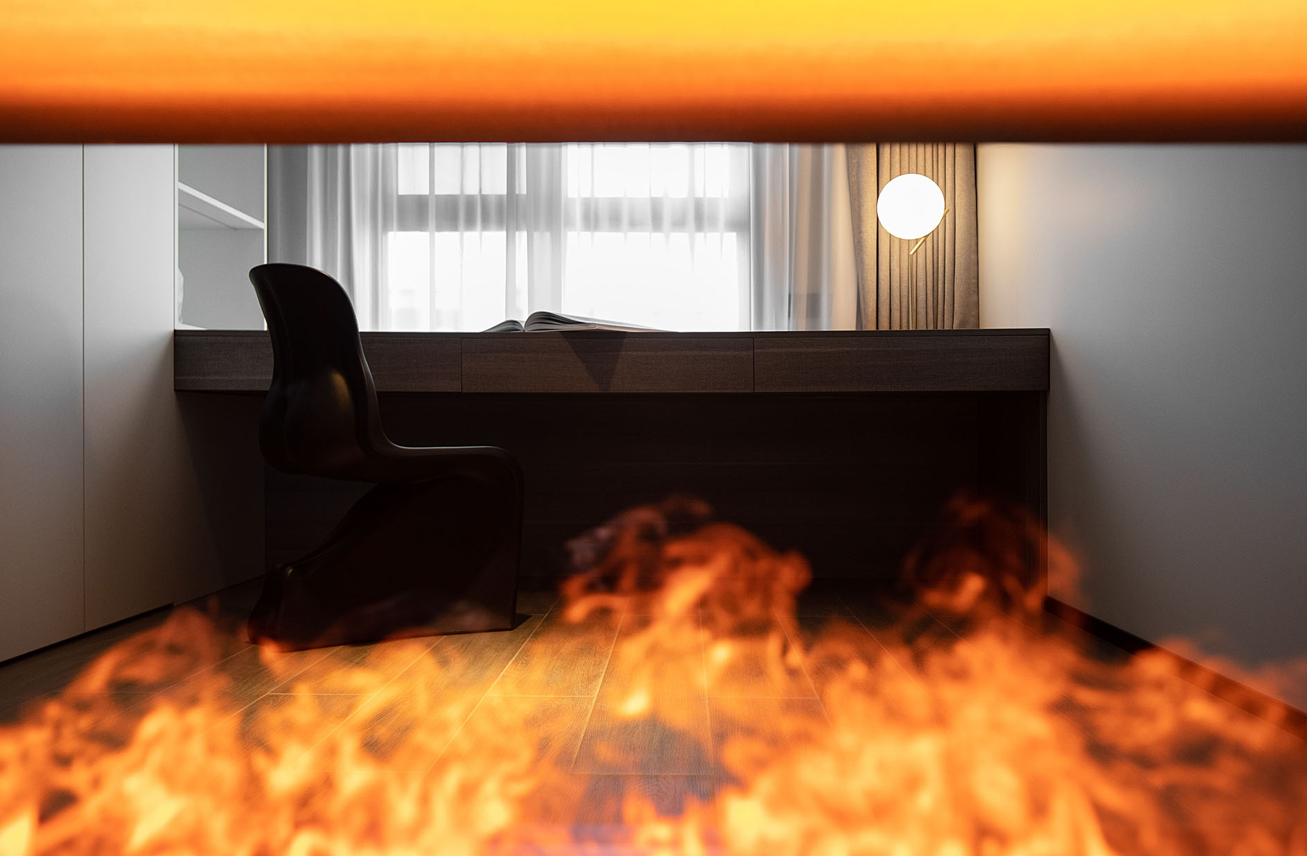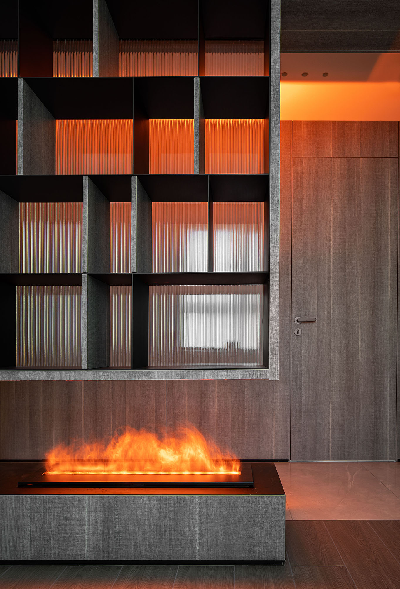 溫暖的火光透過朦朧的玻璃營造出的氛圍感,給居住者濃郁的歸屬感和安全感。