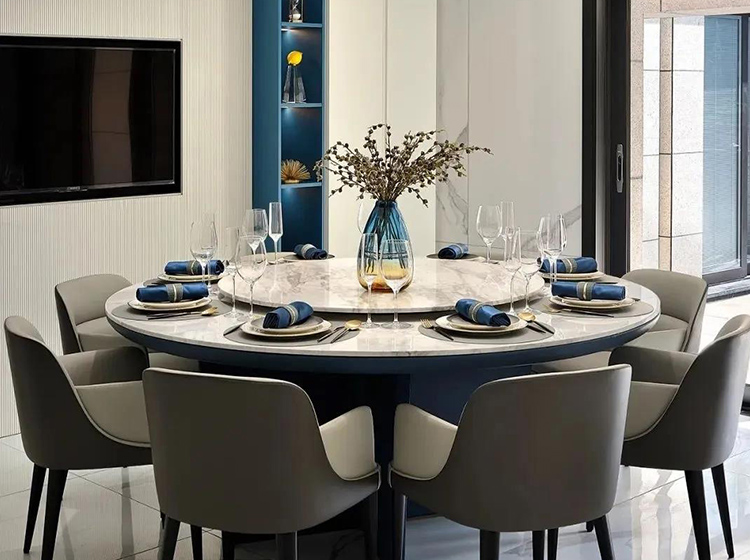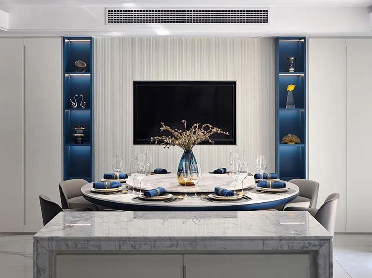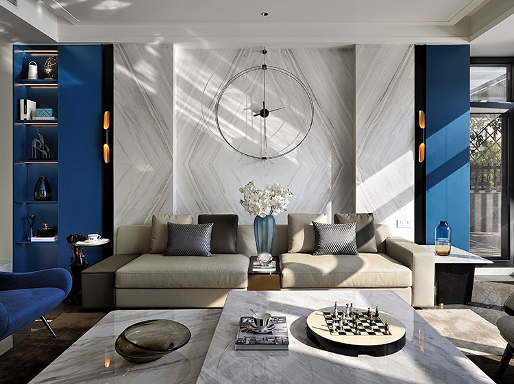 藍(lán)色與大海、晴空等自然景觀能夠產(chǎn)生強(qiáng)烈的關(guān)聯(lián),墻體純潔的乳白色與護(hù)墻板的海藍(lán)色進(jìn)行碰撞,形成強(qiáng)烈的視覺效果,大理石紋做些許點(diǎn)綴,清新優(yōu)雅,仿佛平靜的藍(lán)色海面上泛起層層浪花。