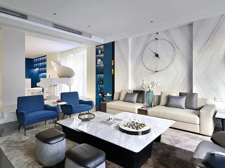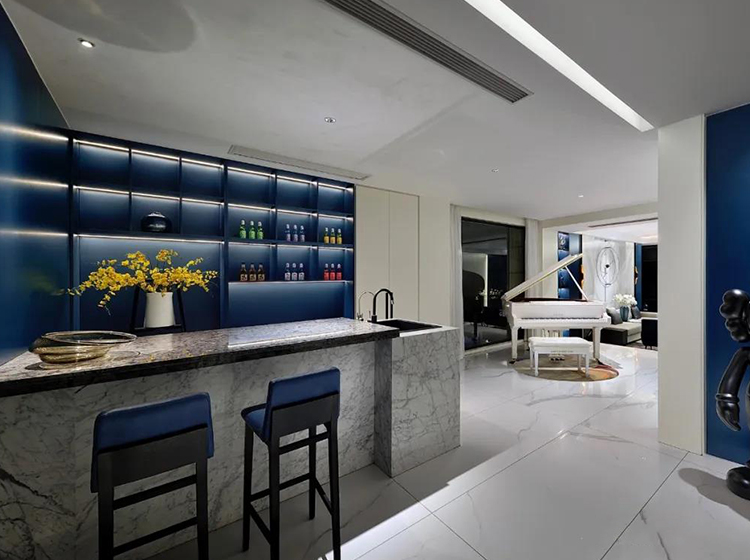 藍(lán)色靜謐,給人以憧憬自由;白色純潔,給人以向往美好。閑暇之余彈一支優(yōu)美的鋼琴曲,足以慰藉自由的靈魂。設(shè)計(jì)師利用一塊隔板將空間分成客廳和休閑區(qū),貌離神合,增強(qiáng)了空間縱深感,層次分明。