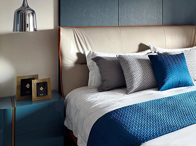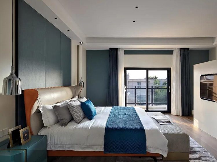藍(lán)色能輕松應(yīng)用于多種不同的材質(zhì)、紋理及表面效果上,既能表達(dá)傳統(tǒng)與優(yōu)雅,也能給人帶來大膽的驚喜。拉絲紋理護(hù)墻就體現(xiàn)了不規(guī)則的光澤,讓整面護(hù)墻充滿靈動(dòng)氣息。床體鑲邊的明艷橙色,裝飾品高貴的藍(lán)絲絨,都給居住者以安全感,為心靈帶來平和與寧?kù)o,提供庇護(hù)。