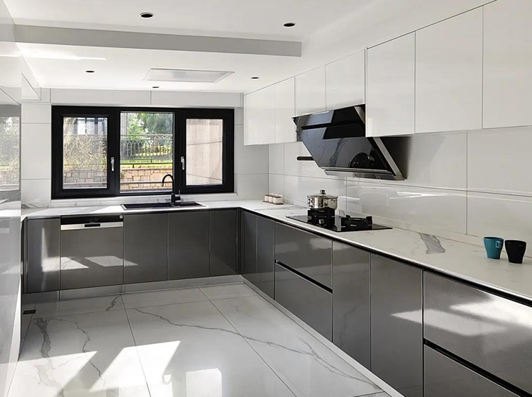 櫥柜的設(shè)計(jì)將極簡(jiǎn)發(fā)揮到了極致,灰色金屬烤漆搭配大理石紋顯得素凈且時(shí)尚,充滿現(xiàn)代氣息。