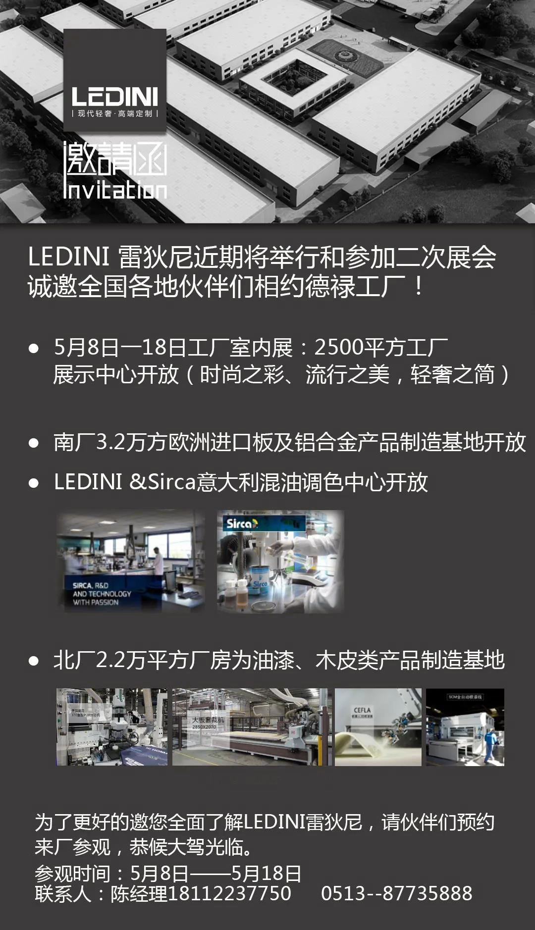 驚艷2020!LEDINI全新打造2500平方家具展示中心于5月8號-18號開放,全方面展示時尚之彩、流行之美、輕奢之簡。3.2萬方歐洲進口板及鋁合金制造基地開放。國內首家定制家具工廠調色中心一一LEDINI