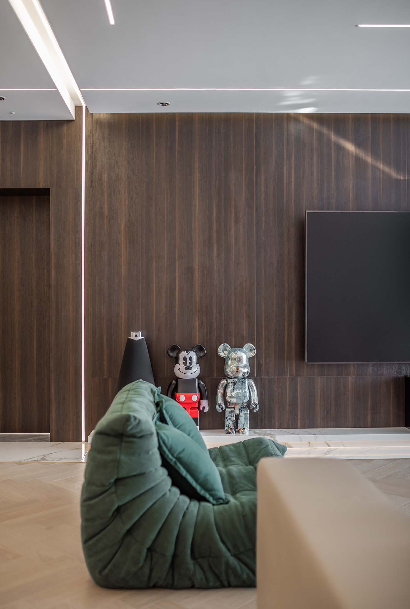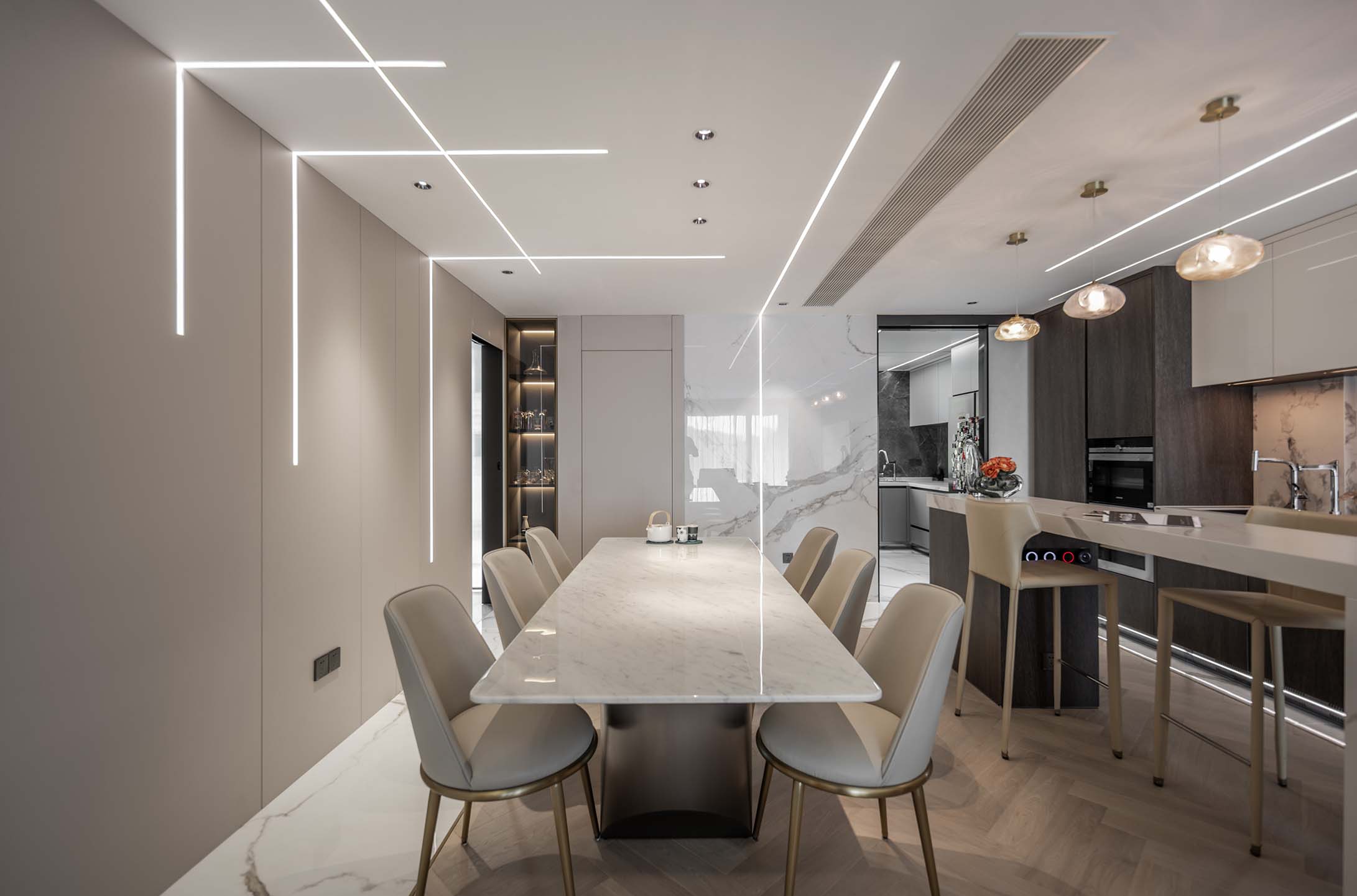 大面積的木紋理自然傾瀉而下,燈帶的點綴賦予空間奢華的高級感。