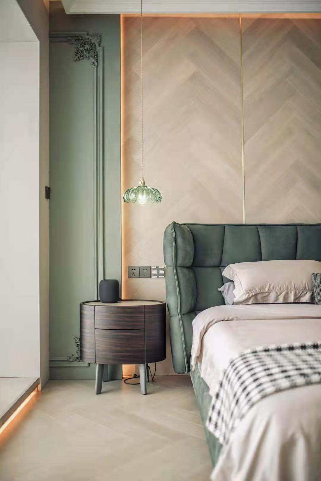 主臥以綠色和灰色調為主,很愜意,很治愈。
