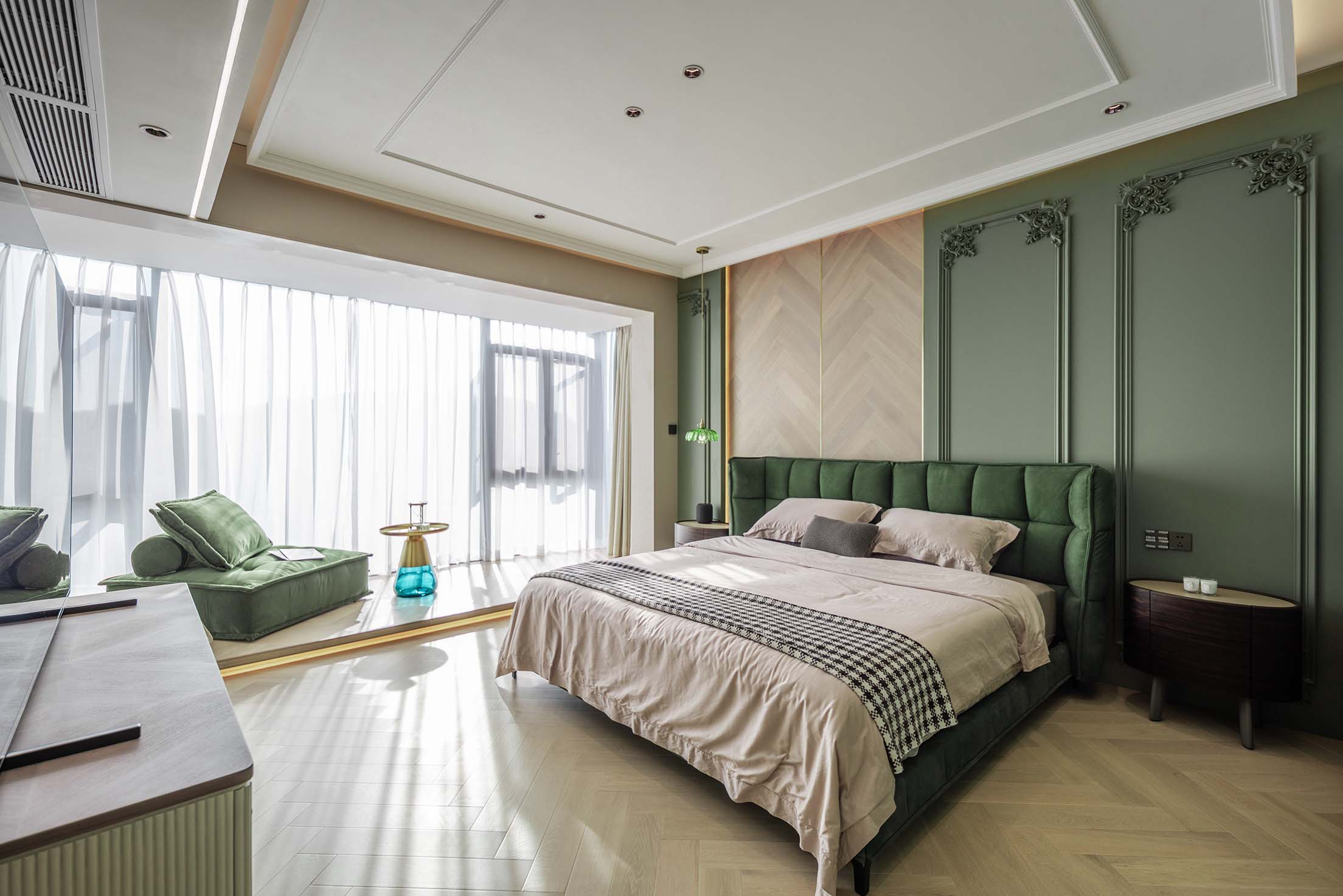 大面積的綠色點綴拼接工藝尼斯木皮,營造精致清新浪漫的氛圍;