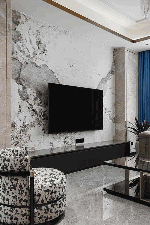 灰白色大理石電視背景墻與黑色電視柜形成了強(qiáng)烈的視覺對(duì)比,