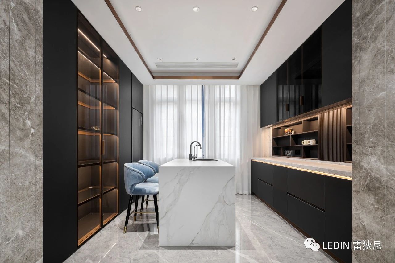 本案中,設(shè)計(jì)師主要選用雷狄尼進(jìn)口烤漆搭配天然的大理石紋,